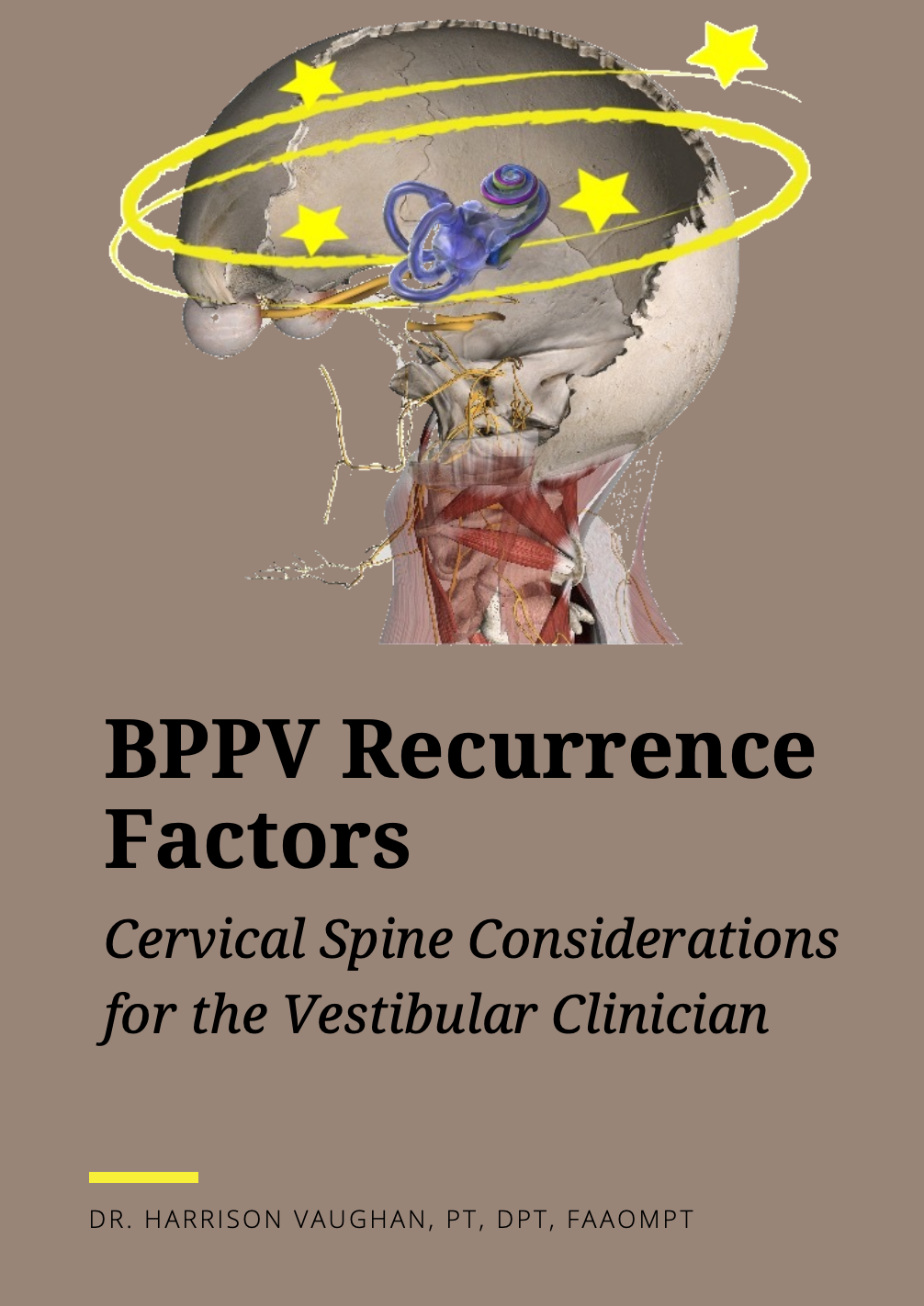 The e-book is a 31 page review outlining cervical spine considerations as a BPPV recurrence factor. I provide detailed information on studies exhibiting manual therapy to improve vascular blood circulation via specific areas and considerations for lack of efficacy behind canalith repositioning procedures.